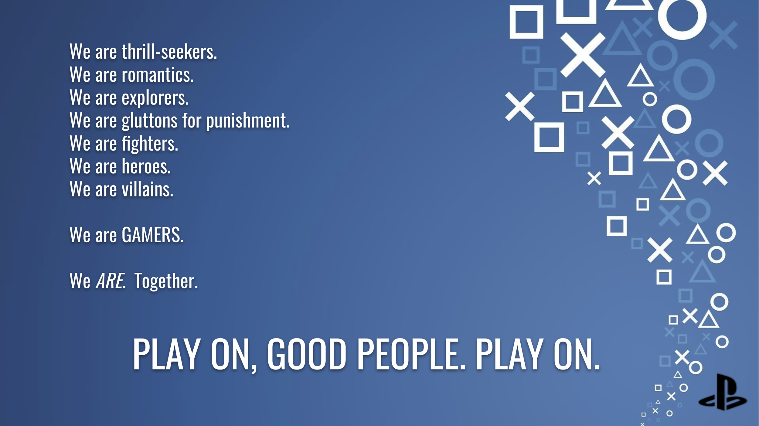 So to all the gamers out there, from the front of the parade to the back, I say this: let's keep having fun, let's keep being ourselves, and most importantly, let's keep playing on. With PlayStation by our side, the future of gaming is brighter than ever before.